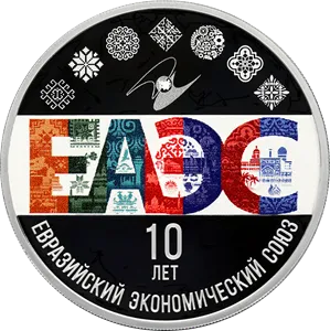 Реверс: надпись «ЕАЭС», выполненная в цвете поверх матовой рельефной площадки; вверху – выполненные в технике лазерного матирования эмблема ЕАЭС и, полукругом, орнаменты государств – участников ЕАЭС и государств – наблюдателей ЕАЭС Кубы и Узбекистана; внизу – рельефные надписи: по окружности – «ЕВРАЗИЙСКИЙ ЭКОНОМИЧЕСКИЙ СОЮЗ», над ней в две строки – «10 ЛЕТ».