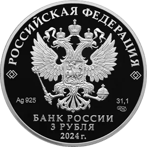 Аверс: рельефное изображение Государственного герба Российской Федерации, над ним вдоль канта – надпись полукругом «РОССИЙСКАЯ ФЕДЕРАЦИЯ», обрамленная с обеих сторон сдвоенными ромбами, под гербом слева – обозначения драгоценного металла и пробы сплава, справа – содержание химически чистого металла и товарный знак монетного двора, внизу в центре в три строки – надпись «БАНК РОССИИ», номинал монеты «3 РУБЛЯ», год выпуска «2024 г.».