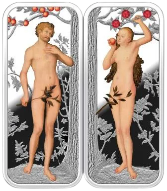 На реверсе монет изображены Адам и Ева в Эдемском саду.