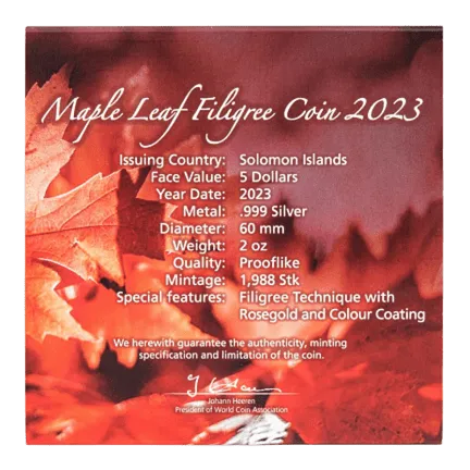 Эта удивительная серебряная монета весом 2 унции посвящена 35-летию первого серебряного кленового листа, выпущенного в Канаде в 1988 году. Монета имеет эффектный дизайн, выполненный с использованием очень изысканной филигранной техники вырезания, имеет пробное качество, покрыта розовым золотом и имеет цветное покрытие. Монета поставляется в футляре, выдержанном в едином стиле, вместе с сертификатом подлинности. Тираж ограничен 1.988 экземплярами по всему миру.