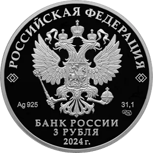 Аверс: рельефное изображение Государственного герба Российской Федерации, над ним вдоль канта – надпись полукругом «РОССИЙСКАЯ ФЕДЕРАЦИЯ», обрамленная с обеих сторон сдвоенными ромбами, под гербом слева – обозначения драгоценного металла и пробы сплава, справа – содержание химически чистого металла и товарный знак монетного двора, внизу в центре в три строки – надпись «БАНК РОССИИ», номинал монеты «3 РУБЛЯ», год выпуска «2024 г.».