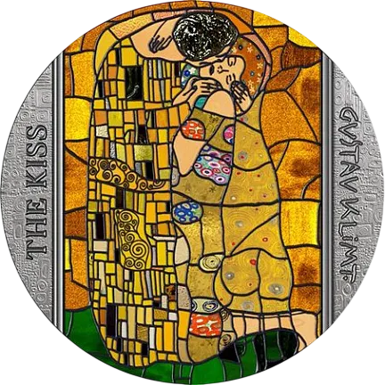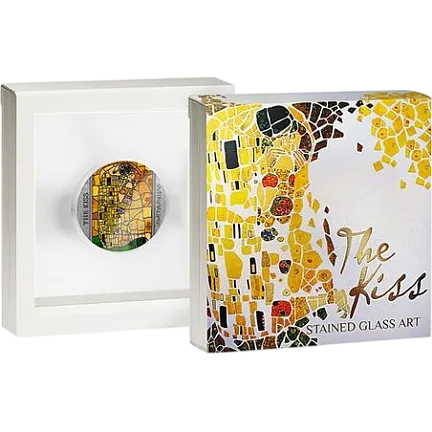 Эта монета абсолютно исключительна благодаря использованию передовой технологии цифровой печати, которая идеально передает интенсивность и красоту объятий. Мистический союз духовной любви и слияние двух личностей с вечной вселенной, застывший во времени на серебряной монете диаметром 70 мм. Интерпретация поцелуя в стиле витражного стекла придает монете уникальное и чарующее измерение, представляя момент, который выходит за рамки поверхностных аспектов.