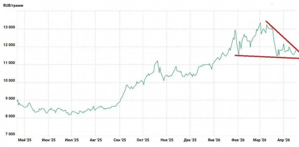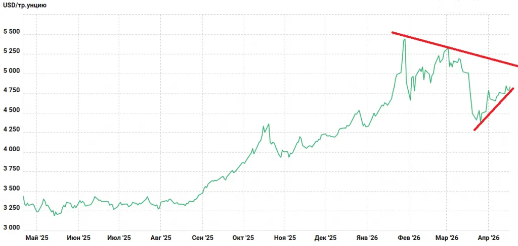 Начало 2026 года было для золота триумфальным. За двенадцать месяцев с марта 2025 года по март 2026 год металл прибавил порядка 47%, поднявшись с трёх тысяч долларов за унцию до уровней выше четырёх с половиной тысяч долларов. В январе цена и вовсе взлетала до исторических максимумов в районе пяти с половиной тысяч. Казалось, ничто не способно остановить этот бычий забег: слабеющий доллар, крайне тревожный геополитический фон, сильный спрос со стороны центральных банков и ETF-фондов — всё работало в одну сторону. Но потом началось то, что и делает этот рынок таким изматывающим.